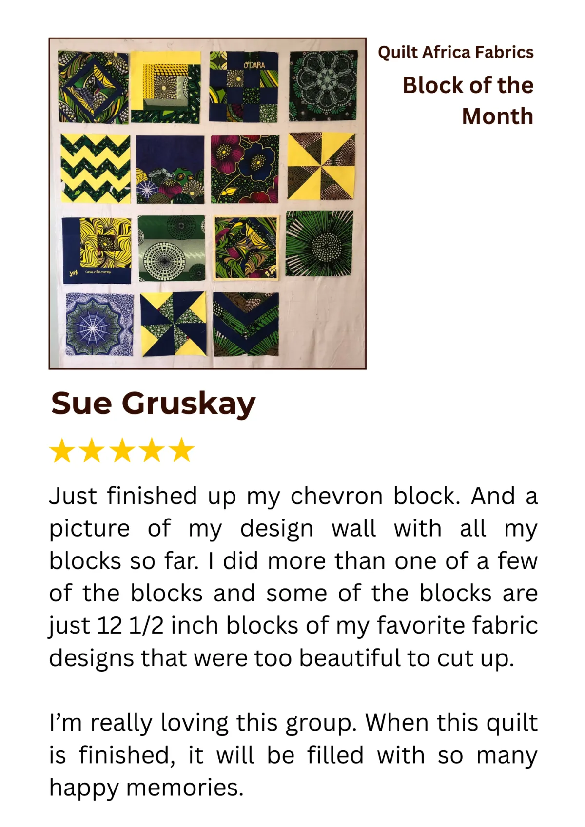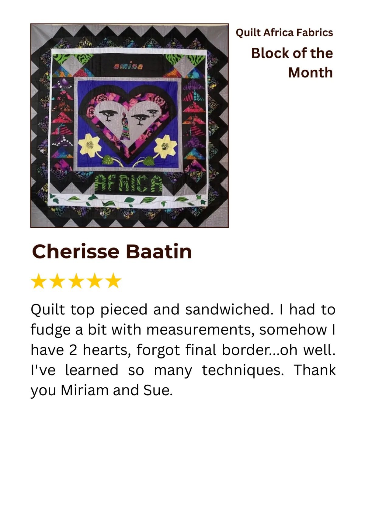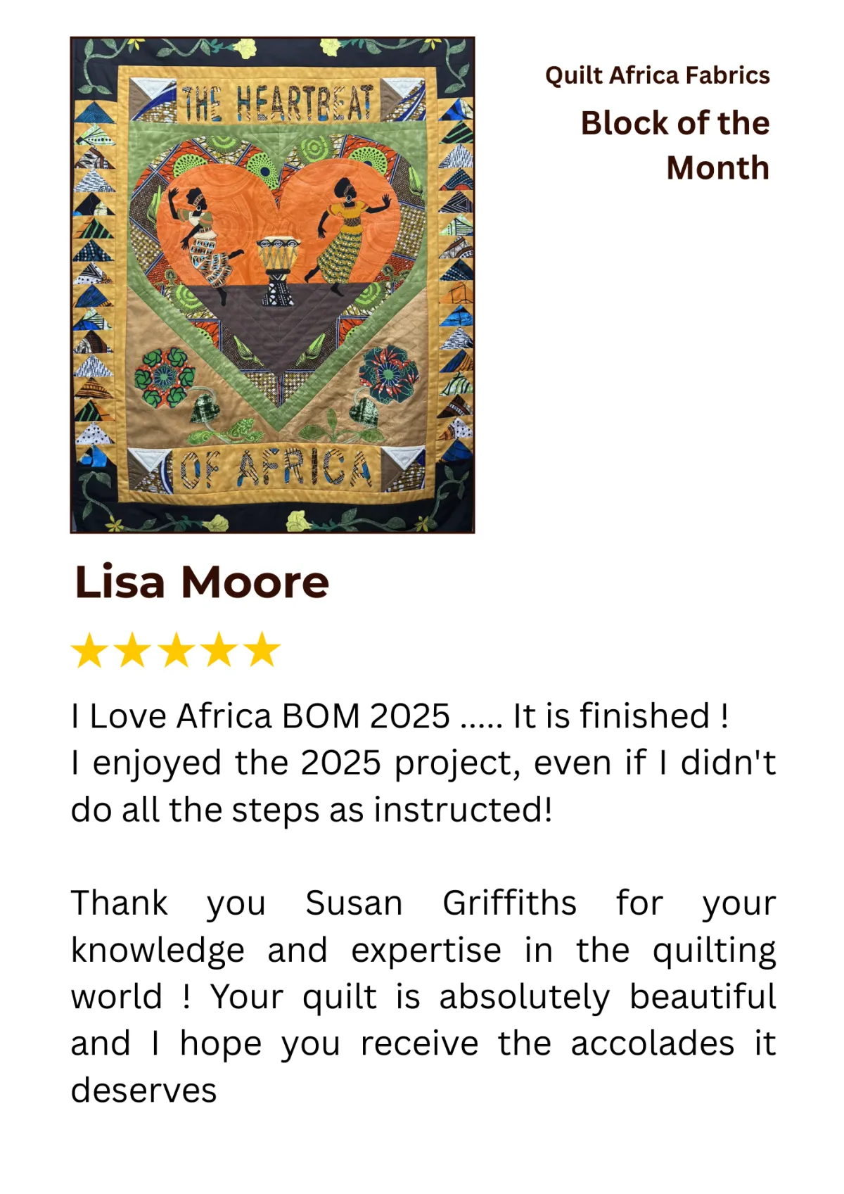 $20 Discount: For the fabric kit for the Echoes of HeritageBOM, ensuring you have the highest quality, perfectly coordinated African print fabrics right from the start!